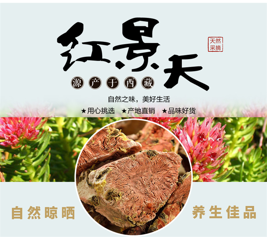 紅景天,中藥名。為景天科大花紅景天的干燥根和根莖,秋季花莖凋枯后采挖,除去粗皮,洗凈,曬干。紅景天的根莖呈圓柱形,粗短,略彎曲,少數有分枝,長5~500px,直徑2.9~112.5px。表面棕色或褐色,粗糙有褶皺,剝開外表皮有一層膜質黃色表皮且粉紅色花紋,宿存部分老花莖,花莖基部被三角形或卵形膜質鱗片,節間不規則,斷面粉紅色至紫紅色,有一環紋,質輕,疏松。主根呈圓柱形,粗短,長約500px,上部直徑約37.5px,側根長10~750px;斷面橙紅色或紫紅色,有時具裂隙。氣芳香,味微苦澀、后甜。